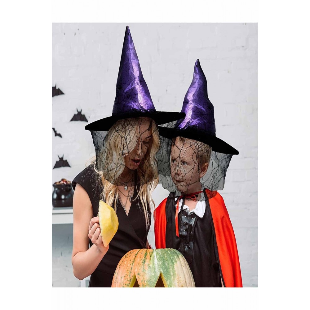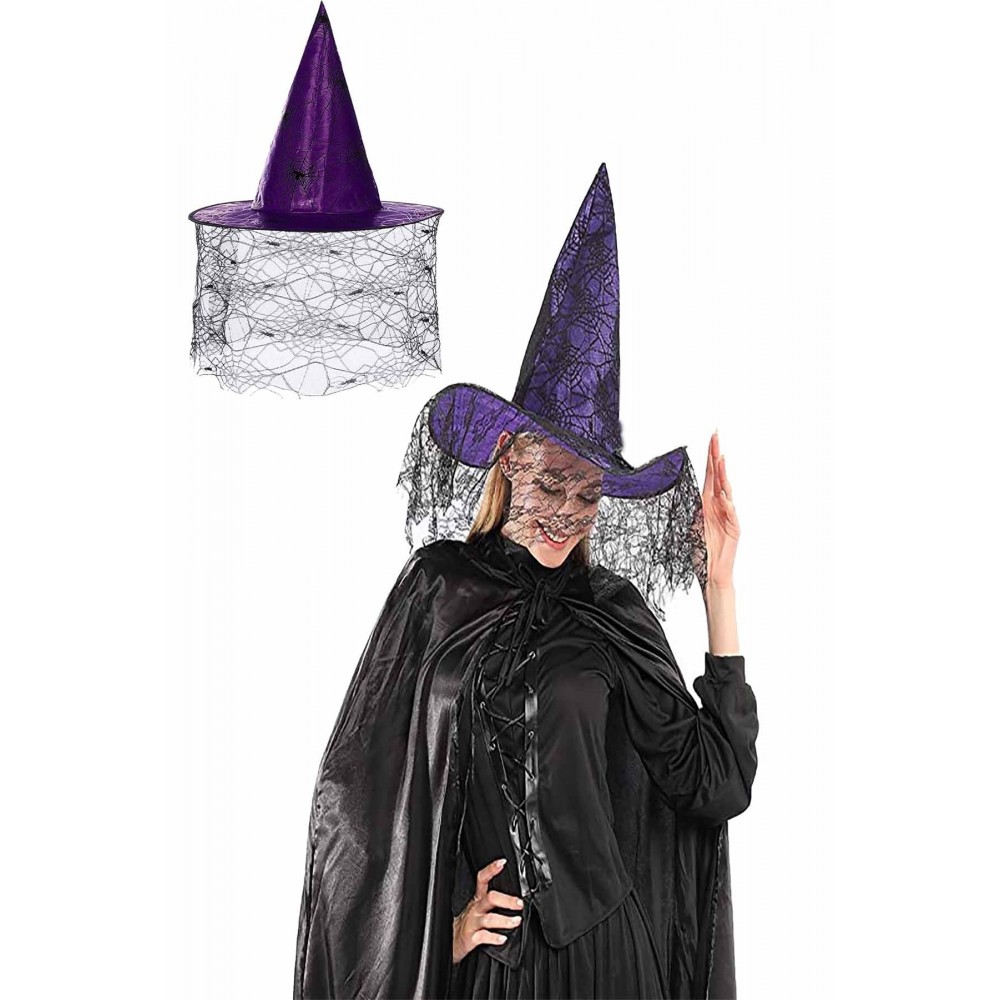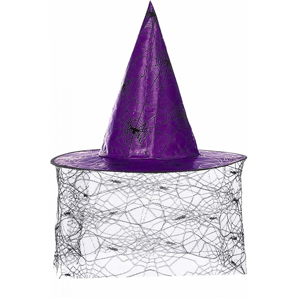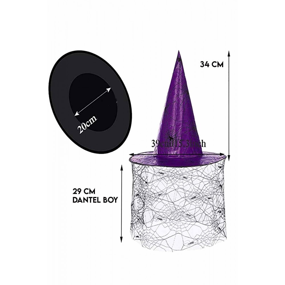 Halloween Cadılar Bayramı Cadı Şapkası Mor Siyah Örümcek Ağ Desenli Tül Parti Cadı Şapkası 34cm