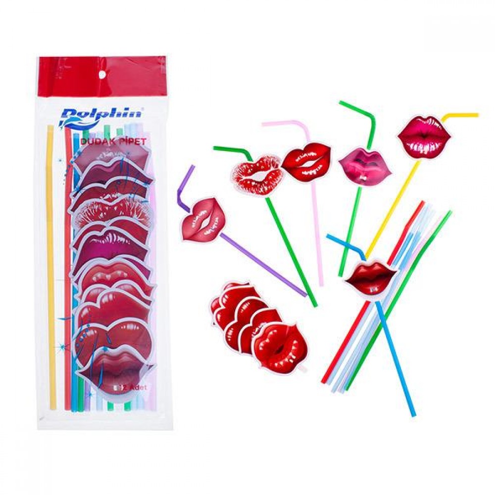 12 adet renkli körüklü pipet karton dudak aksesuarı.